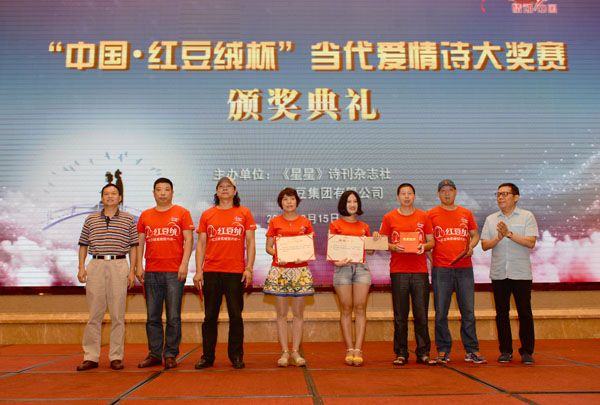 為了進(jìn)一步繁榮愛情詩(shī)創(chuàng)作,弘揚(yáng)正確愛情觀,特別是推動(dòng)中國(guó)當(dāng)代愛情詩(shī)再度輝煌,2014年7月1日,由《星星》詩(shī)刊雜志社與紅豆集團(tuán)聯(lián)合啟動(dòng)了“中國(guó)?紅豆絨杯”當(dāng)代愛情詩(shī)大獎(jiǎng)賽征文活動(dòng),作為紅豆七夕節(jié)的一項(xiàng)重要活動(dòng)?,F(xiàn)在經(jīng)過(guò)一年的征集及后期評(píng)選,在今年七夕——中國(guó)情人節(jié)前夕頒獎(jiǎng)。