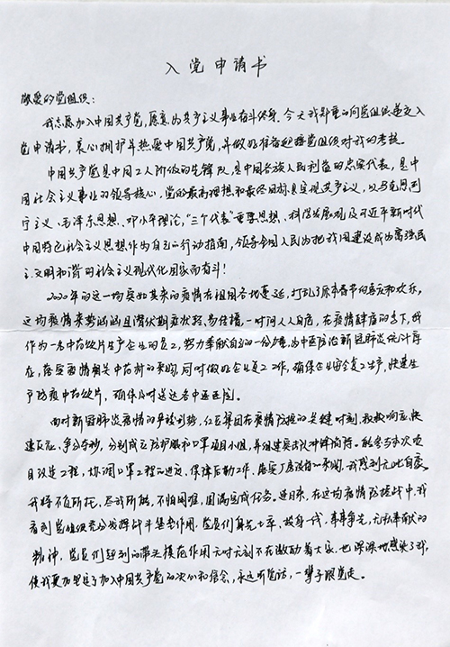 紅豆集團(tuán)國際公司的員工梁艷的再次向黨組織遞交入黨申請書的原因很簡單,“為了支持一線疫情防控,集團(tuán)緊急組建黨員突擊隊(duì)支援防護(hù)服、口罩生產(chǎn)線,負(fù)責(zé)最緊急、最艱苦的工作。我也報(bào)名了,因我還不是黨員,所以沒有把最重的任務(wù)安排給我?!笔艿缴磉咟h員的激勵,讓梁艷鼓起勇氣,擬出了這份“疫情火線入黨申請書”。